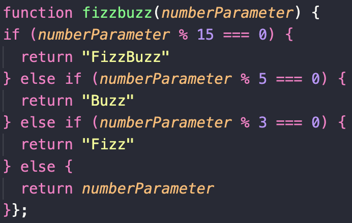 Fizzbuzz, this is a coding challenge that crossed my path. The solution sounded like a simple conditional statement from the beginning (click here and have a read of the first paragraph under control flow if you need a refresher on conditional statements) The question was to fill in a function (click here if you want a refresher on functions) that takes a number as a parameter, then if that number can be divided by 15 return a string, if it can be divided by 3 return a different string, if can be divided by 5 return a different string, otherwise just return the number. I knew this statement required a % from my past experience learning conditional statements, cause if a number divided by 3 gets divided perfectly, the remainder should equal 0. I wrote the conditional statement near correct from the start but completely out of order. Reviewing the testing results, I realised it must be in a certain order and the adjusted the statement to suit.
