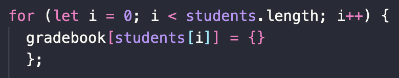So during some coding Kata's back at Dev Academy(think of it as code training questions to help build skills), we had to add each student from an array(an array is a varible that holds a list of data) to a property of the gradebook(gradebook is an object, inside an object you can have key(property) and value(property type) pairs). I started this question with a for loop (click here if you need a refresher on loops, arrays and objects) as I knew we had to go through each student in the array, but we had to add them to the gradebook as a empty object, which to be honest I was pretty stumped on and I struggled with the syntax for adding them as an empty object. Still trying to get my head around the syntax after the loop to give me my desired result, I really had to google a lot for this question and used a bracket notation for the end result which I have not really used before.